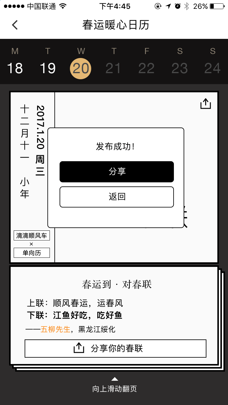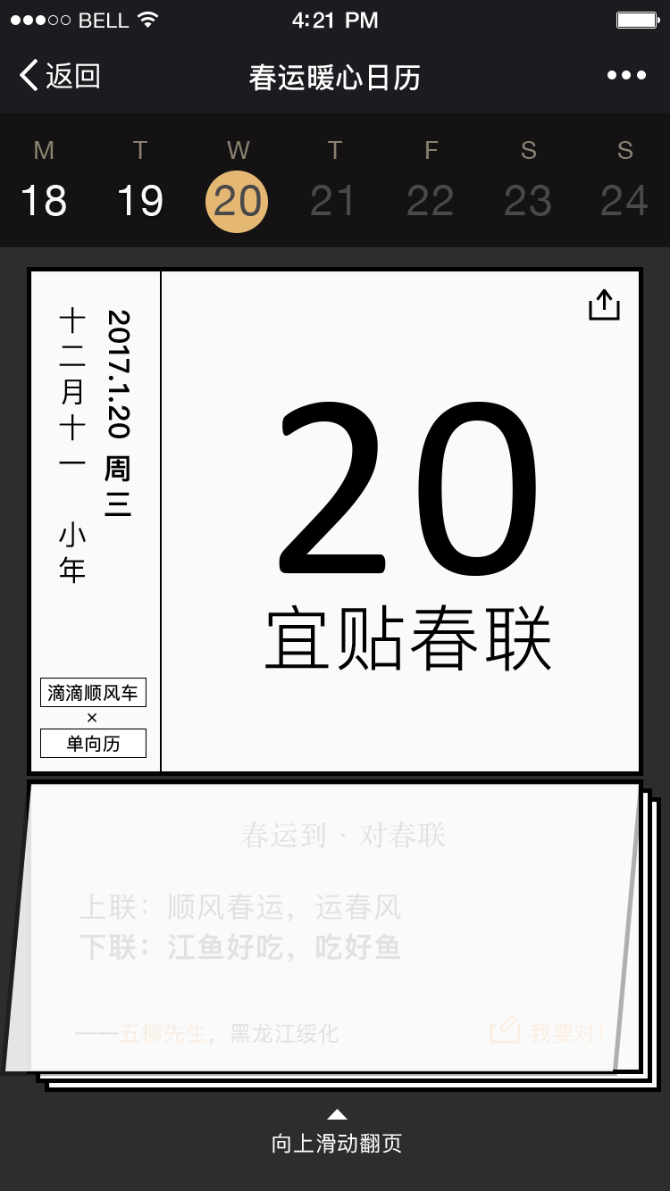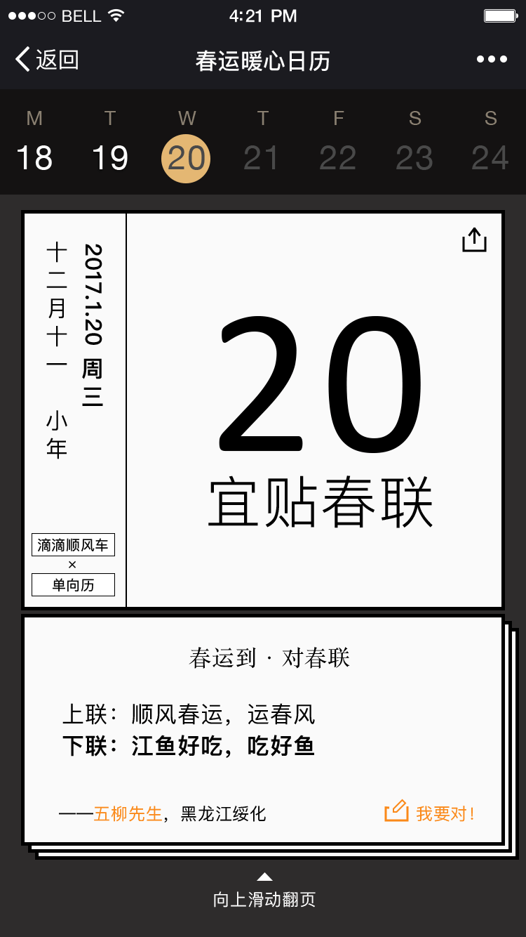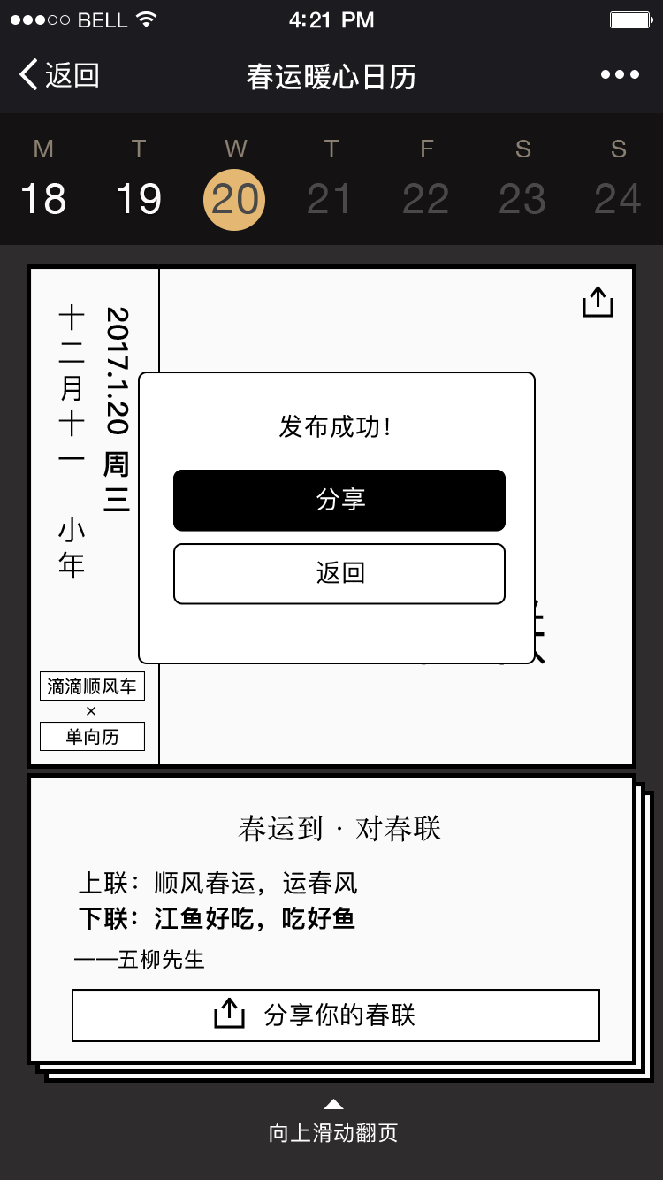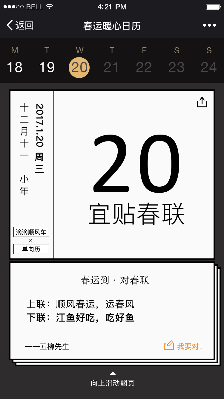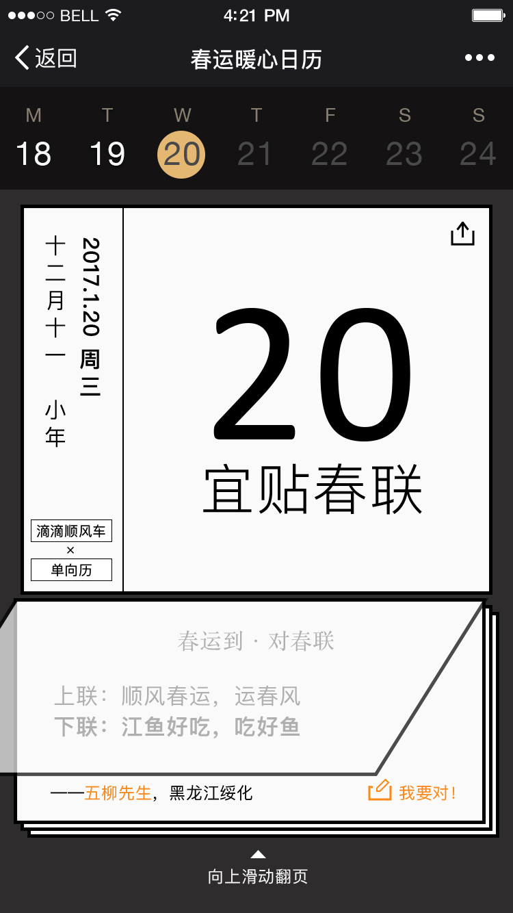 Spring Festival Transportation Calendar: This is a promotion webpage developed in collaboration with One-Way Street Bookstore. To attract user interaction, we added a traditional Chinese couplet game to the page. Additionally, to match the partner's product style, we incorporated some micro animations into the design.