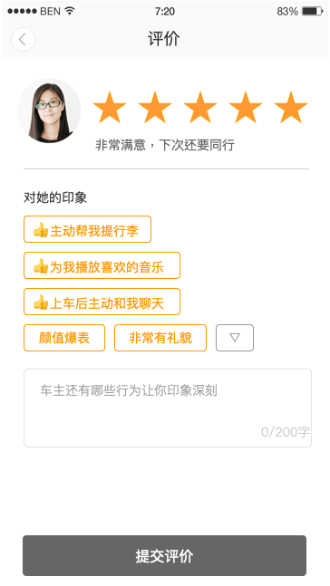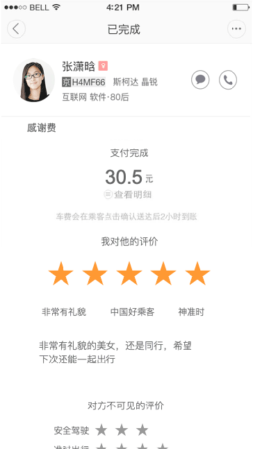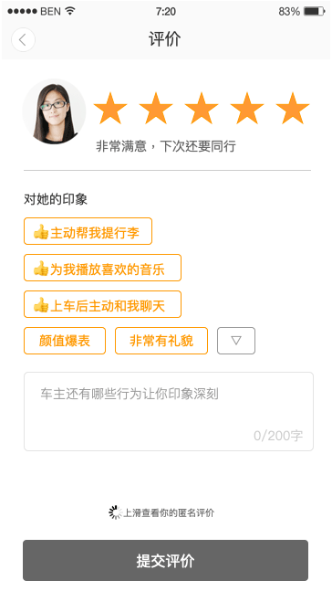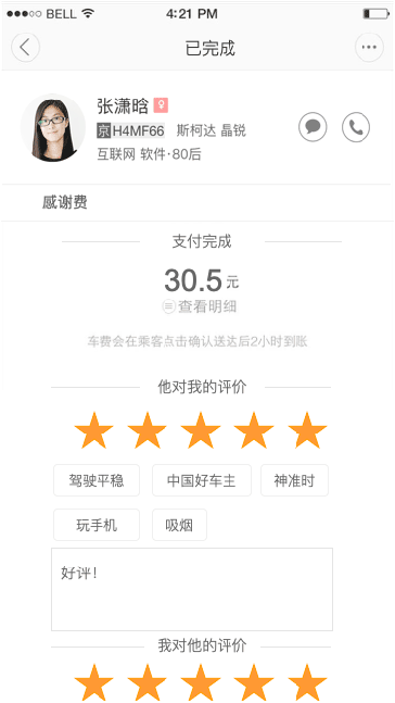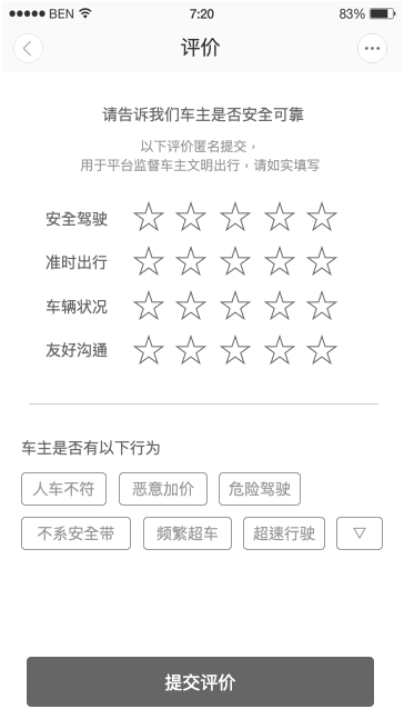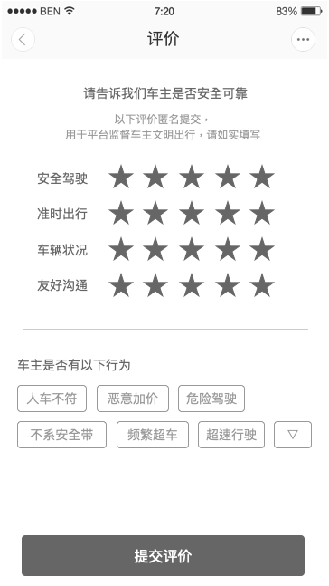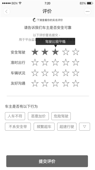 The Post-Trip Feedback Page: After a trip concludes, DiDi Hitch collects subjective feedback from both passengers and drivers via this page, which informs our ongoing efforts to improve platform quality and refine product details. The feedback page is divided into real-name and anonymous sections. Positive evaluations are displayed under real names to both parties, while negative feedback is submitted anonymously to the backend system, serving as one indicator in the mutual trust scoring mechanism.